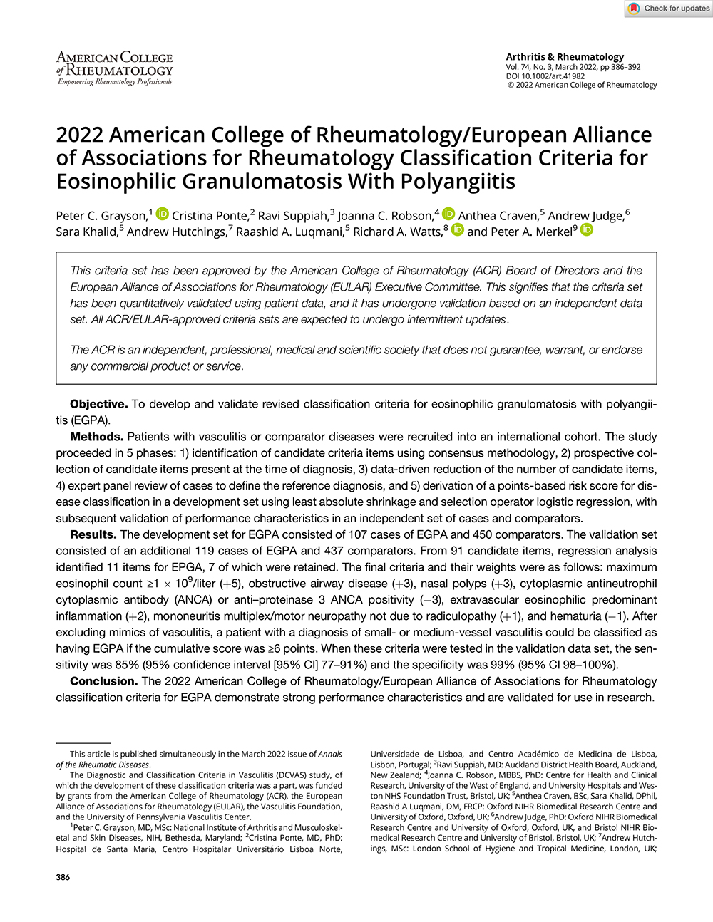 2022 ACR/EULAR 嗜酸性肉芽腫性多血管炎的分類標準