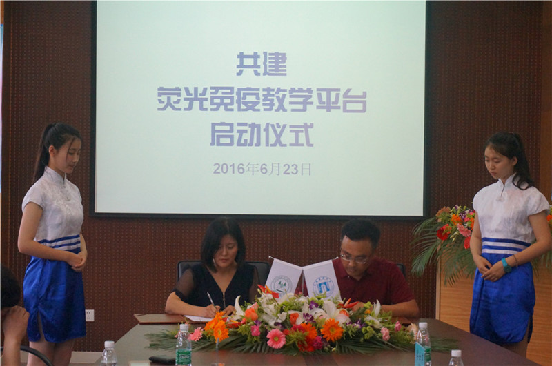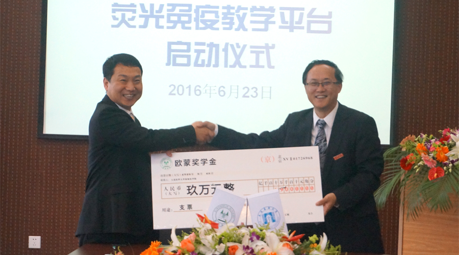 近日,歐蒙學院攜其“高校聯盟”項目來到大連醫科大學檢驗醫學院,雙方在歐蒙獎學金和熒光免疫教學平臺共建領域展開深入合作,“大連醫科大學檢驗醫學院-歐蒙學院簽約暨共建熒光免疫教學平臺啟動儀式”也于2016年6月23日上午隆重舉行。