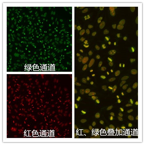 EUROPattern拍出的圖片,共有三種。綠色通道,即與熒光顯微鏡拍出的圖片相同。紅色通道,細(xì)胞核經(jīng)過碘化丙啶紅色復(fù)染,通過紅色通道獲取信息,不僅可以幫助尋找和識別細(xì)胞核和分裂期細(xì)胞,還可以避免可能出現(xiàn)的假陰性結(jié)果。紅綠疊加通道,可以清晰的觀察區(qū)分細(xì)胞核與細(xì)胞胞漿信息。