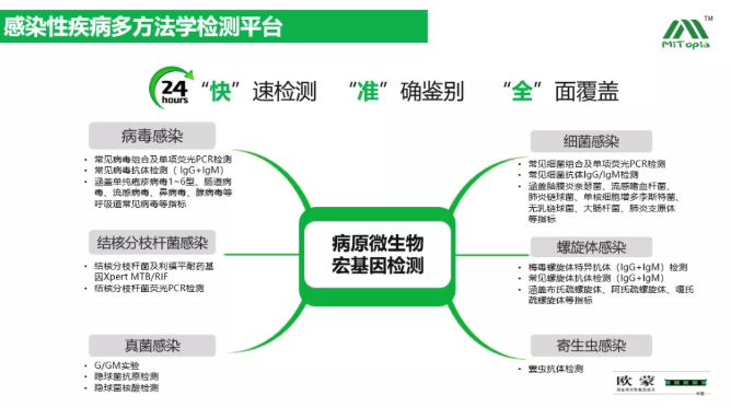 歐蒙醫(yī)學(xué)不僅可以為臨床醫(yī)生提供全面的免疫病因相關(guān)的血清學(xué)檢測(cè)項(xiàng)目,還可以提供感染病因相關(guān)的病原學(xué)檢測(cè)項(xiàng)目。周教授通過結(jié)合臨床中遇到的實(shí)際案例,為大家介紹了在間質(zhì)性肺炎患者人群中識(shí)別感染、明確感染原的重要性。mNGS是目前已被臨床醫(yī)生廣泛認(rèn)可的技術(shù),在病毒、細(xì)菌、真菌以及混合感染方面都具有明顯優(yōu)勢(shì),敏感性遠(yuǎn)遠(yuǎn)優(yōu)于傳統(tǒng)的診斷方法。mNGS因其具備更加快速、更加全面的進(jìn)行病原診斷的特點(diǎn),更有助于臨床醫(yī)生更早期的靶向治療,進(jìn)而提高其生存率。除mNGS技術(shù)之外,歐蒙還可以提供多方法學(xué)、多平臺(tái)的病原體檢測(cè)項(xiàng)目,以及間質(zhì)性肺病活動(dòng)性及預(yù)后血清學(xué)標(biāo)志物的檢測(cè),以此提供更準(zhǔn)確、全面的結(jié)果。