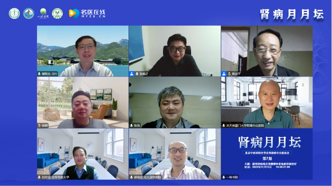 最后,謝院生教授衷心感謝2位講者和5位點(diǎn)評(píng)、討論嘉賓的精彩報(bào)告和經(jīng)驗(yàn)分享,感謝線上的萬(wàn)余名聽眾的大力支持和關(guān)注,感謝北京中西醫(yī)結(jié)合學(xué)會(huì)的指導(dǎo)和支持!感謝歐蒙亞太集團(tuán)、一味書院、北京中西醫(yī)結(jié)合腎臟疑難病會(huì)診中心、名醫(yī)在線平臺(tái)工作人員的辛勤勞動(dòng)。相約12月13日晚上“腎病月月壇”(第8期)再見。