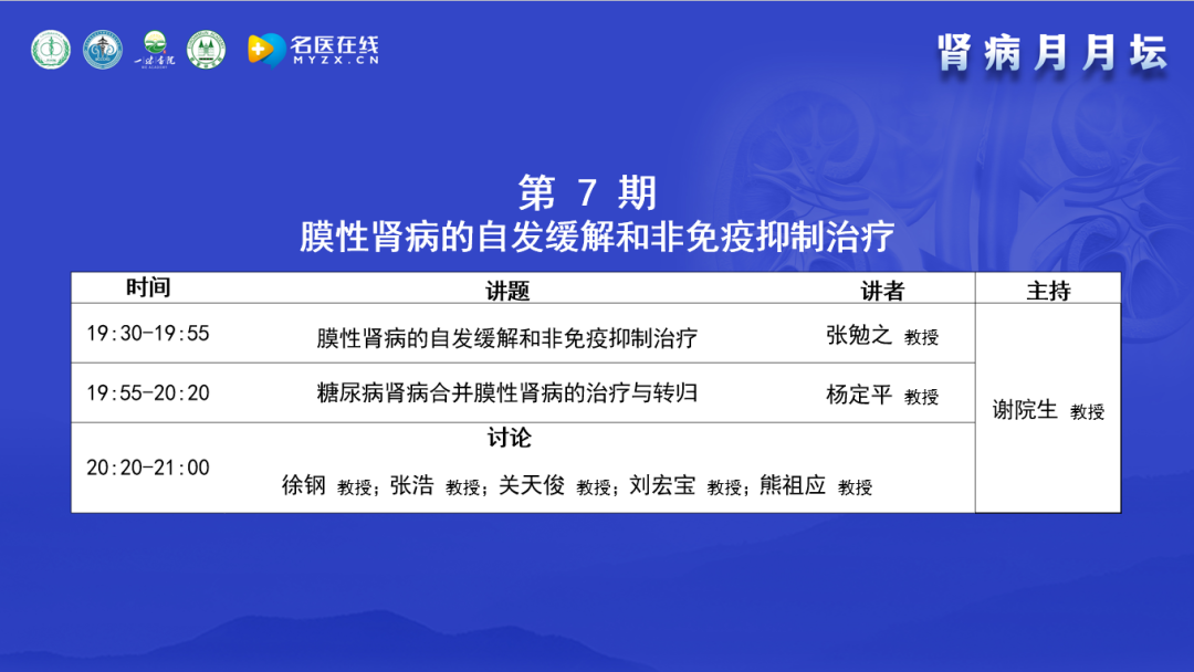 疫情可能影響大家相聚,但卻阻止不了學(xué)術(shù)交流,“腎病月月壇”第七期如期而至。謝教授代表北京中西醫(yī)結(jié)合學(xué)會(huì)腎臟病專業(yè)委員會(huì)對(duì)各位專家、各位同仁及各位朋友出席本期“腎病月月壇”表示熱烈的歡迎和衷心的感謝。謝教授介紹,“腎病月月壇”簡(jiǎn)單五個(gè)字卻蘊(yùn)含著三層寓意:首先,“腎病”是指咱們論壇聚焦腎病和腎臟相關(guān)疾病的診斷、治療和預(yù)防,臨床、科研和教學(xué)。因?yàn)楝F(xiàn)在腎臟病很常見,腎臟病的診療手段日升月異。比如膜性腎病,血中抗體的無(wú)創(chuàng)診斷,單克隆抗體的合理使用等,不學(xué)習(xí)就會(huì)落伍。其次,是“月月”,本論壇每個(gè)月舉辦一次,時(shí)間固定在每個(gè)月第三周的星期二晚上19:30-21:30,以便于參會(huì)者能夠提前安排好時(shí)間準(zhǔn)時(shí)參加線上直播,同時(shí),為了滿足時(shí)間確實(shí)沖突無(wú)法參加線上直播又迫切想學(xué)習(xí)的同行而提供了回放功能;最后是“壇”,“壇”也有三層意思,一是學(xué)術(shù)論壇,在這里只要是學(xué)術(shù)相關(guān)的內(nèi)容,什么都可以說(shuō)。二是談話、交談,大家可以在這里平等地交談。三是平臺(tái),學(xué)術(shù)交流的平臺(tái)、思想交流的平臺(tái),情感交流的平臺(tái),我們很多老朋友很久沒(méi)有見面了,通過(guò)腎病月月壇,可以每個(gè)月在云端見面一次。謝教授介紹道,“腎病月月壇”自今年5月17日開壇以來(lái),每期一個(gè)主題,已經(jīng)舉辦了六期,包括“激素和免疫抑制劑在膜性腎病的合理應(yīng)用”、“利妥昔單抗在膜性腎病的合理應(yīng)用”、“原發(fā)性和繼發(fā)性膜性腎病的鑒別”及“中醫(yī)對(duì)膜性腎病的認(rèn)識(shí)”、“膜性腎病的抗原分類及發(fā)病機(jī)制”以及“膜性腎病的臨床表現(xiàn)、無(wú)創(chuàng)診斷和病理診斷”。本期論壇的主題是“膜性腎病的自發(fā)緩解和非免疫抑制治療”。邀請(qǐng)的講者和點(diǎn)評(píng)、討論嘉賓都是業(yè)內(nèi)非常著名的臨床專家、研究生導(dǎo)師、業(yè)務(wù)院長(zhǎng)、大內(nèi)科主任、腎內(nèi)科主任,具有豐富的臨床、教學(xué)和科研經(jīng)驗(yàn),相信他們的分享一定會(huì)對(duì)大家的臨床診療有所幫助。