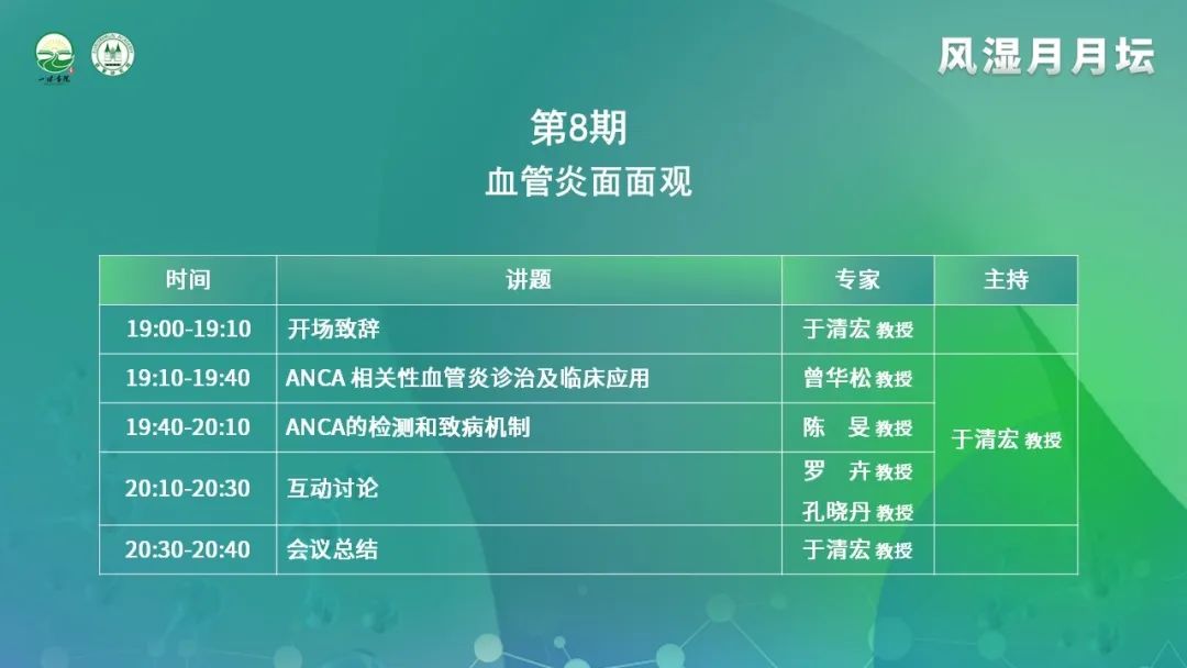 作為本次會議的大會主席,于清宏教授首先表示非常高興與各位同道、各位專家線上相見,參與到一味書院舉辦的第八期風濕月月壇中,非常榮幸能夠以線上的形式與大家相聚,一同就ANCA相關性血管炎問題進行探討。