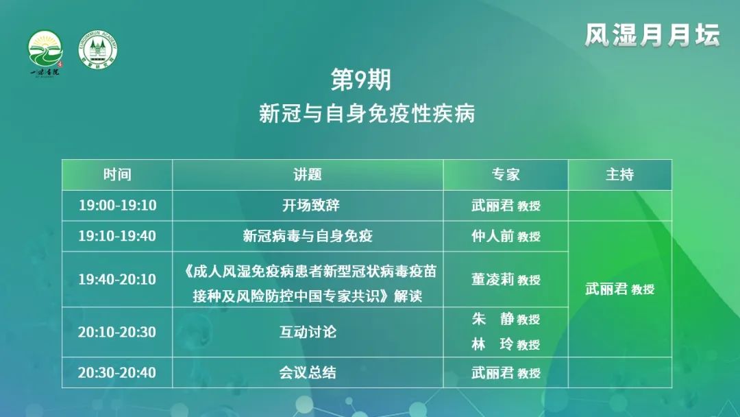 2023年4月17日(周一),由一味書院主辦的《風(fēng)濕月月壇(第9期)—新冠與自身免疫性疾病》于線上成功舉行。本次論壇由新疆維吾爾自治區(qū)人民醫(yī)院武麗君教授擔(dān)任大會(huì)主席,原上海長征醫(yī)院仲人前教授、華中科技大學(xué)同濟(jì)醫(yī)學(xué)院附屬同濟(jì)醫(yī)院董凌莉教授作為講課嘉賓,四川省人民醫(yī)院朱靜教授、汕頭大學(xué)醫(yī)學(xué)院第一附屬醫(yī)院林玲教授作為本次大會(huì)的討論嘉賓。