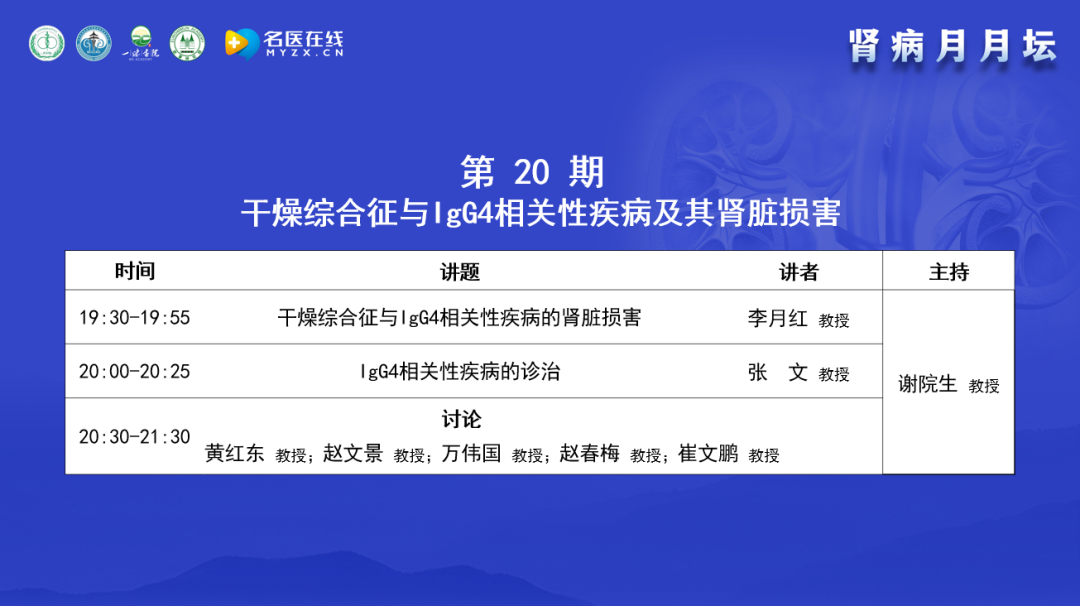 謝教授介紹了“腎病月月壇”的歷史,“腎病月月壇“是在2022年5月疫情防控期間開始的線上交流活動。其形式是講座與病例討論相結合;論壇內容以臨床問題和臨床需求為導向,通過中醫和西醫的結合、腎科和其他學科的結合,以期提升腎臟病相關領域的診療水平。本期討論和交流的主要內容是干燥綜合征與IgG4相關性疾病及其腎臟損害,邀請的講者和討論嘉賓都是在該領域有很深造詣的專家,相信能為大家帶來有價值的內容。