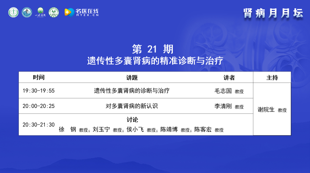 2024年1月16日,由北京中西醫(yī)結(jié)合學(xué)會(huì)腎臟病專業(yè)委員會(huì)舉辦的《腎病月月壇(第21期)——遺傳性多囊腎病的精準(zhǔn)診斷與治療》于線上成功舉行。本次論壇由北京中西醫(yī)結(jié)合學(xué)會(huì)腎臟病專業(yè)委員會(huì)主任委員、北京中西醫(yī)結(jié)合腎臟疑難病會(huì)診中心主任、解放軍總醫(yī)院謝院生教授擔(dān)任大會(huì)主席,海軍軍醫(yī)大學(xué)上海長征醫(yī)院毛志國教授、解放軍總醫(yī)院第一醫(yī)學(xué)中心李清剛教授作為講課嘉賓,華中科技大學(xué)同濟(jì)醫(yī)學(xué)院附屬同濟(jì)醫(yī)院徐鋼教授、北京中醫(yī)藥大學(xué)東直門醫(yī)院劉玉寧教授、北京大學(xué)第三醫(yī)院侯小飛教授、臺(tái)灣高雄長庚紀(jì)念醫(yī)院陳靖博教授以及陸軍軍醫(yī)大學(xué)陸軍特色醫(yī)學(xué)中心陳客宏教授作為本次大會(huì)的討論嘉賓。