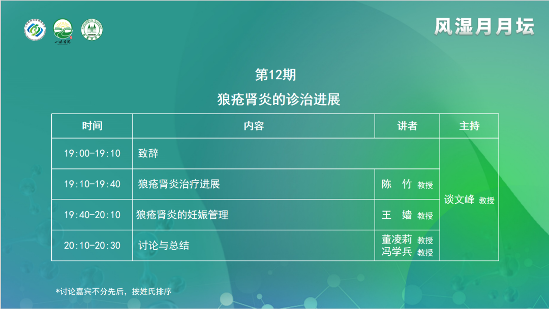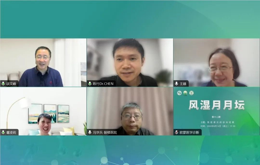2024年8月14日(周三),由江蘇省研究型醫(yī)院學(xué)會(huì)和一味書院主辦的《風(fēng)濕月月壇(第12期)—狼瘡腎炎的診治進(jìn)展》于線上成功舉辦。本次論壇由江蘇省人民醫(yī)院談文峰教授擔(dān)任大會(huì)主席,安徽省立醫(yī)院陳竹教授、江蘇省人民醫(yī)院王嬙教授作為講課嘉賓,華中科技大學(xué)同濟(jì)醫(yī)學(xué)院附屬同濟(jì)醫(yī)院董凌莉教授、南京大學(xué)醫(yī)學(xué)院附屬鼓樓醫(yī)院馮學(xué)兵教授作為本次會(huì)議的討論嘉賓。