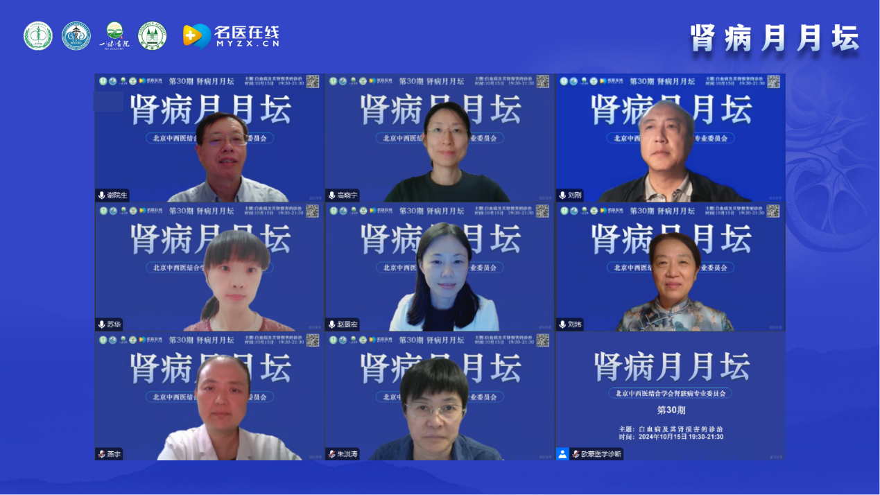 2024年10月15日,由北京中西醫結合學會腎臟病專業委員會舉辦的《腎病月月壇(第30期)——白血病及其腎損害的診治》于線上成功舉行。本次論壇由北京中西醫結合學會腎臟病專業委員會主任委員、北京中西醫結合腎臟疑難病會診中心主任、北京大學航天中心醫院主任醫師特聘教授、解放軍總醫院及南開大學醫學院博士生導師謝院生教授擔任大會主席,解放軍總醫院高曉寧教授、北京大學第一醫院劉剛教授作為講課嘉賓,華中科技大學協和醫院蘇華教授、陸軍軍醫大學新橋醫院趙景宏教授、 河南省兒童醫院劉煒教授、北京大學人民醫院燕宇教授以及新疆醫科大學第一附屬醫院朱洪濤教授作為本次大會的討論嘉賓。