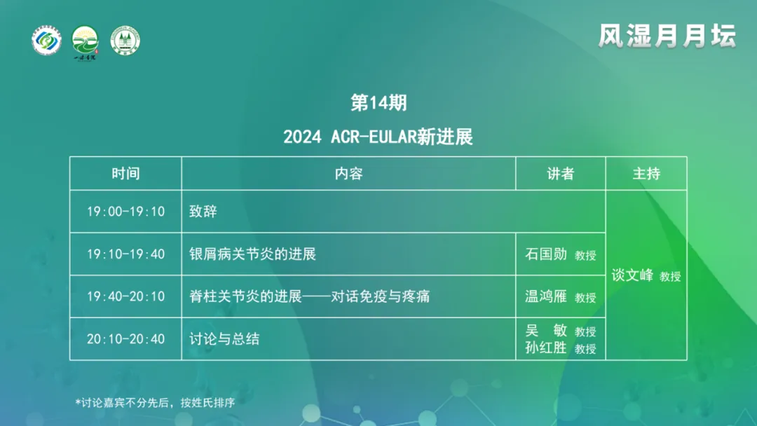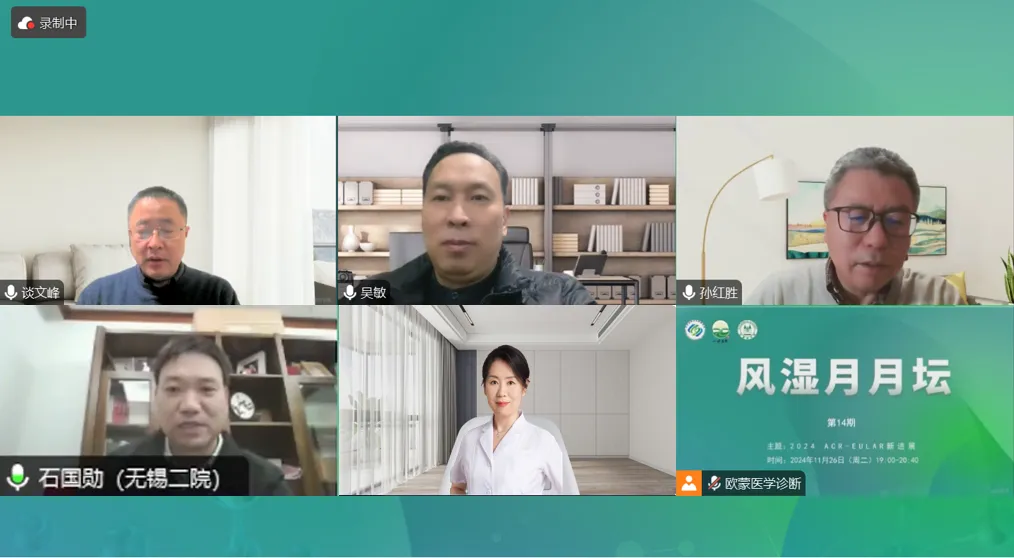 2024年11月26日(周二),由江蘇省研究型醫(yī)院學會和一味書院主辦的《風濕月月壇(第14期)—2024 ACR-EULAR(美國風濕病學會年會、歐洲風濕病聯(lián)盟年會)新進展》于線上成功舉辦。本次論壇由江蘇省人民醫(yī)院談文峰教授擔任大會主席,無錫市第二人民醫(yī)院石國勛教授、山西醫(yī)科大學第一醫(yī)院溫鴻雁教授作為講課嘉賓,常州市第一人民醫(yī)院吳敏教授、山東省立醫(yī)院孫紅勝教授作為本次會議的討論嘉賓。