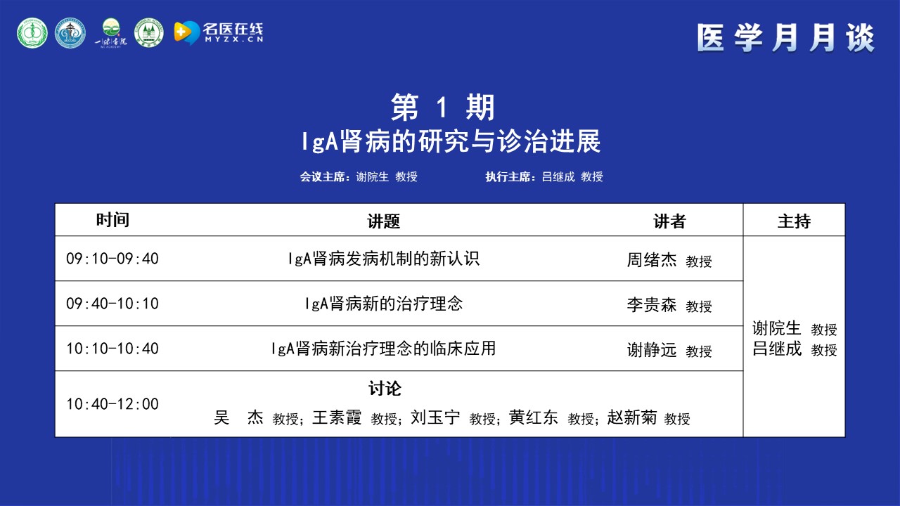 2025年3月22日,由北京中西醫(yī)結(jié)合學(xué)會舉辦的醫(yī)學(xué)月月談(第1期):IgA腎病的研究與診治進展于線上線下同步舉行。本次論壇由北京中西醫(yī)結(jié)合學(xué)會腎臟病專業(yè)委員會主任委員、北京中西醫(yī)結(jié)合腎臟疑難病會診中心主任、北京大學(xué)航天中心醫(yī)院腎內(nèi)科主任醫(yī)師特聘教授、解放軍總醫(yī)院及南開大學(xué)醫(yī)學(xué)院博士生導(dǎo)師謝院生教授擔(dān)任大會主席,北京大學(xué)第一醫(yī)院呂繼成教授擔(dān)任大會執(zhí)行主席,北京中西醫(yī)結(jié)合學(xué)會劉剛秘書長及歐蒙醫(yī)學(xué)診斷CEO、一味書院執(zhí)行院長、發(fā)起人李川先生擔(dān)任致辭嘉賓,北京大學(xué)第一醫(yī)院周緒杰教授、四川省人民醫(yī)院李貴森教授、上海交通大學(xué)醫(yī)學(xué)院附屬瑞金醫(yī)院謝靜遠(yuǎn)教授作為講課嘉賓,解放軍總醫(yī)院吳杰教授、北京大學(xué)第一醫(yī)院王素霞教授、北京中醫(yī)藥大學(xué)東直門醫(yī)院劉玉寧教授、首都醫(yī)科大學(xué)附屬北京友誼醫(yī)院黃紅東教授以及北京大學(xué)人民醫(yī)院趙新菊教授作為本次大會的討論嘉賓。