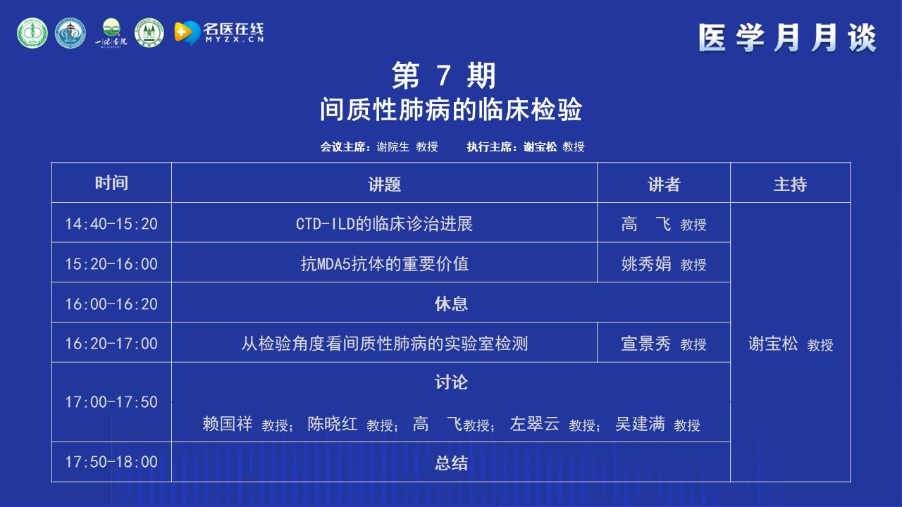 謝教授簡單介紹了“醫學月月談”的前身“腎病月月壇”的歷史,“腎病月月壇”是在疫情防控期間開展的線上學術交流活動,以腎臟病或系統性疾病腎損害的診治為主,每期一個主題,形式和內容都很受歡迎。為了讓更多的人受益,升級為“醫學月月談”。“醫學月月談”是一個以臨床需求為導向,以解決臨床問題為目的,線下和線上相結合的醫學交流活動。本期醫學月月談的主題是間質性肺病的臨床檢驗,非常榮幸的邀請到在間質性肺病領域非常著名的謝寶松教授作為本期的執行主席,相信本期月月談將在謝教授的引導下,在各位專家們的大力支持下,取得圓滿成功。