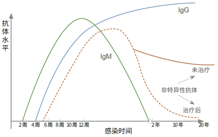梅毒感染的診斷需綜合流行病學(xué)史、臨床表現(xiàn)和實(shí)驗(yàn)室檢查等。梅毒IgM最早出現(xiàn),抗體水平與疾病活動(dòng)度及治療效果相關(guān)。梅毒IgG 4周左右出現(xiàn),不易消退,可持續(xù)終生。
